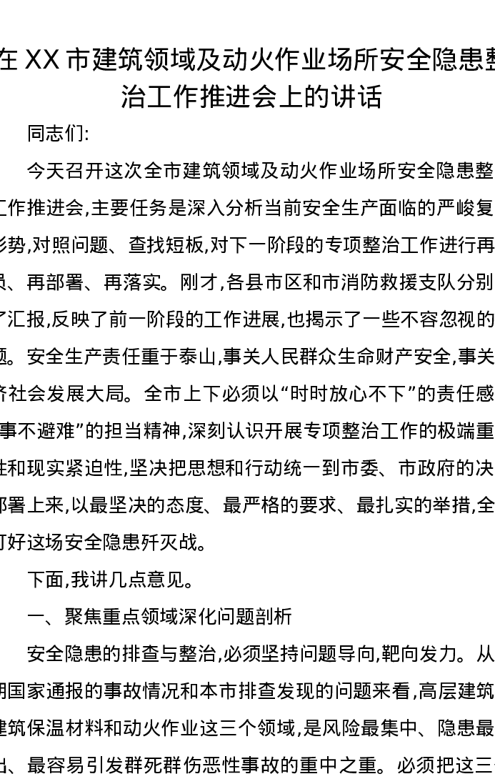 在XX市建筑领域及动火作业场所安全隐患整治工作推进会上的讲话
