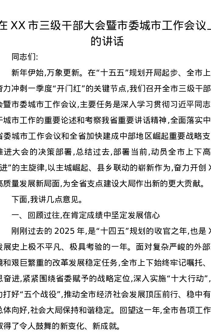 在XX市三级干部大会暨市委城市工作会议上的讲话