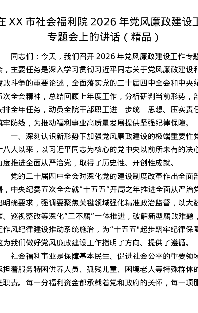 在XX市社会福利院2026年党风廉政建设工作专题会上的讲话