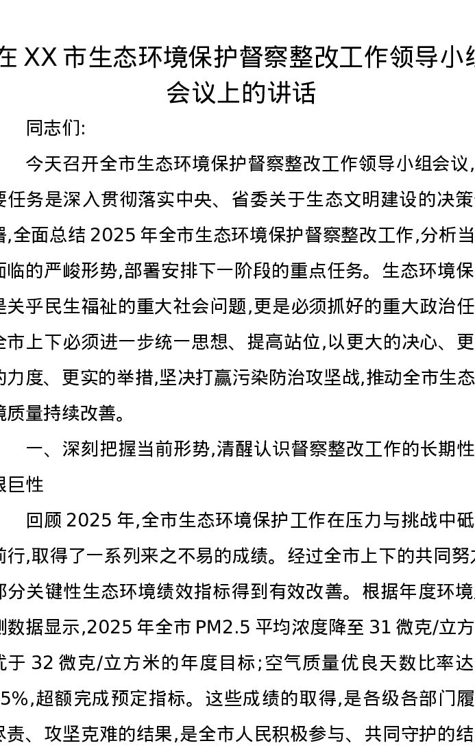 在XX市生态环境保护督察整改工作领导小组会议上的讲话