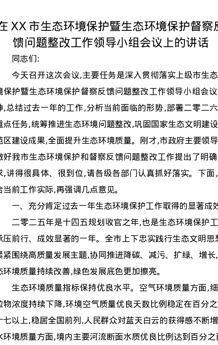 在XX市生态环境保护暨生态环境保护督察反馈问题整改工作领导小组会议上的讲话