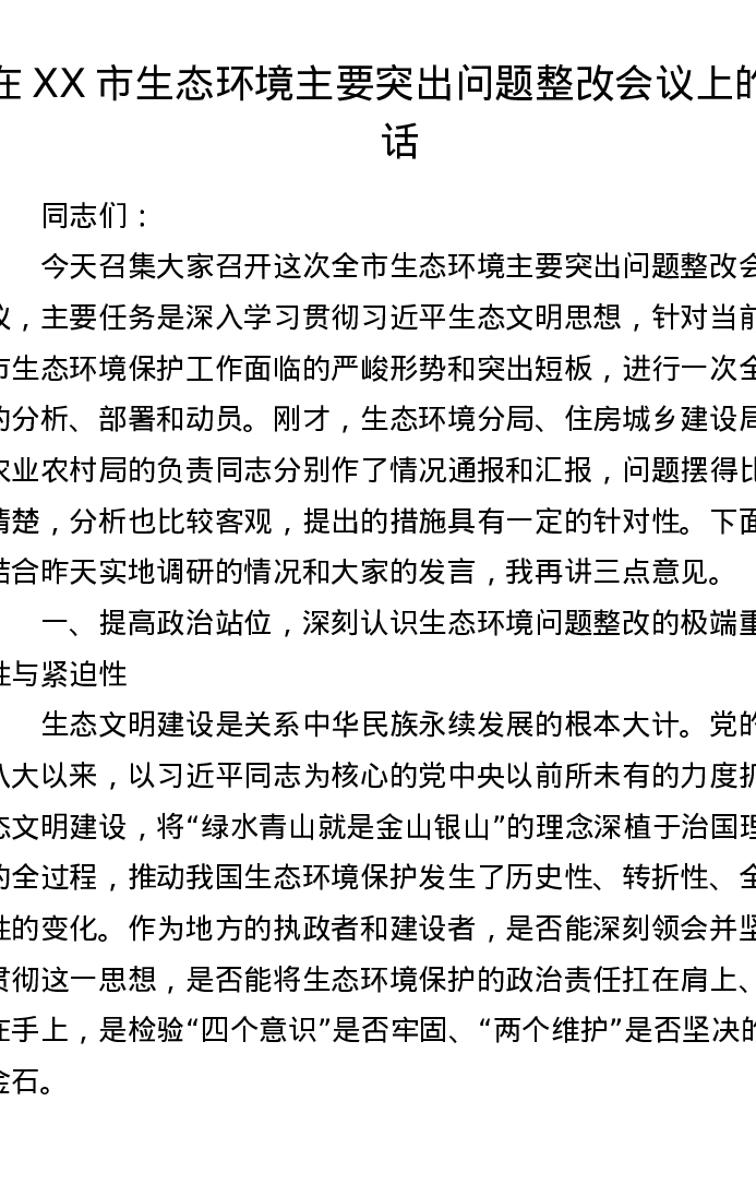 在XX市生态环境主要突出问题整改会议上的讲话
