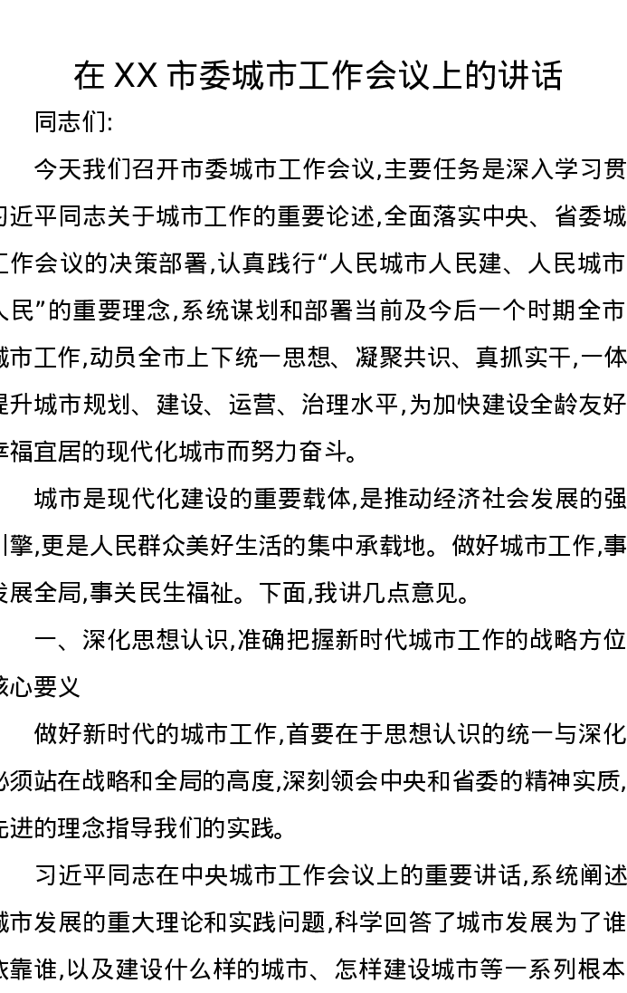 在XX市委城市工作会议上的讲话