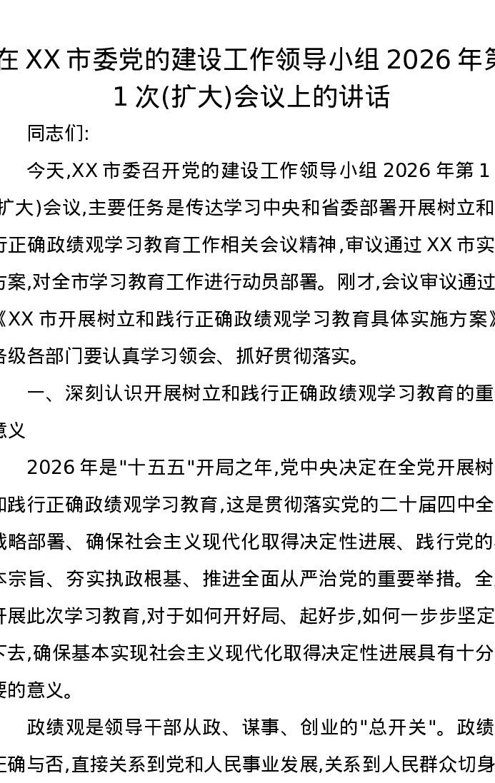 在XX市委党的建设工作领导小组2026年第1次(扩大)会议上的讲话