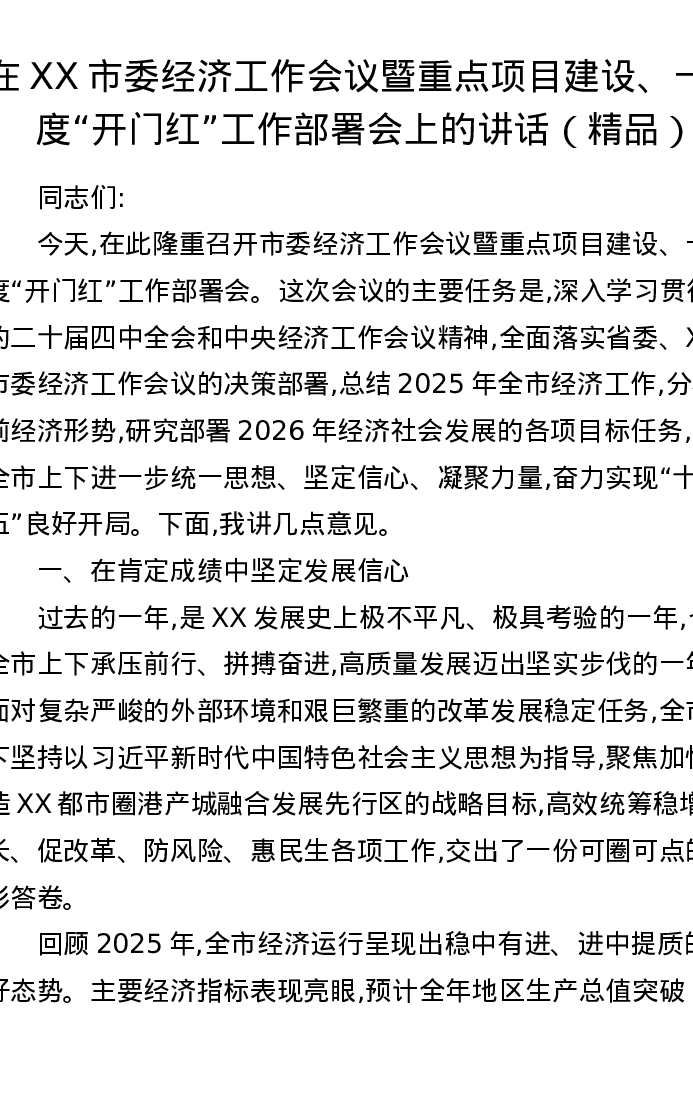 在XX市委经济工作会议暨重点项目建设、一季度开门红工作部署会上的讲话