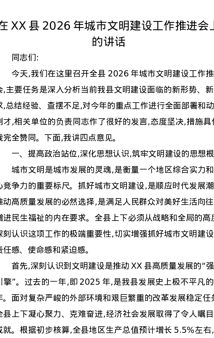 在XX县2026年城市文明建设工作推进会上的讲话