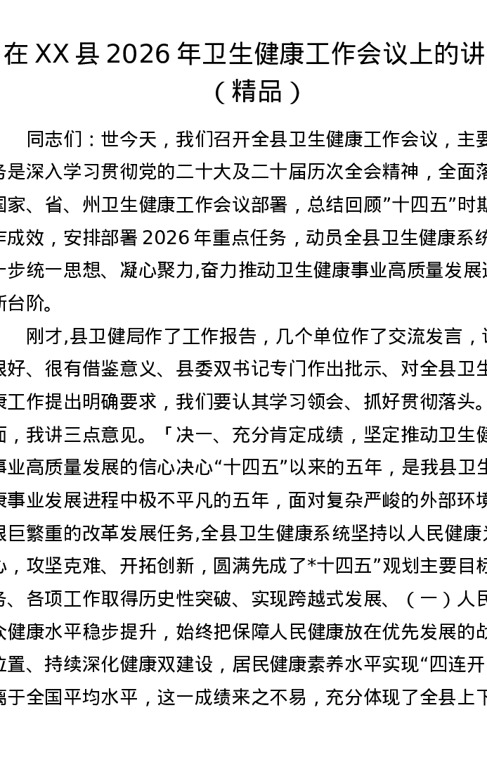 在XX县2026年卫生健康工作会议上的讲话
