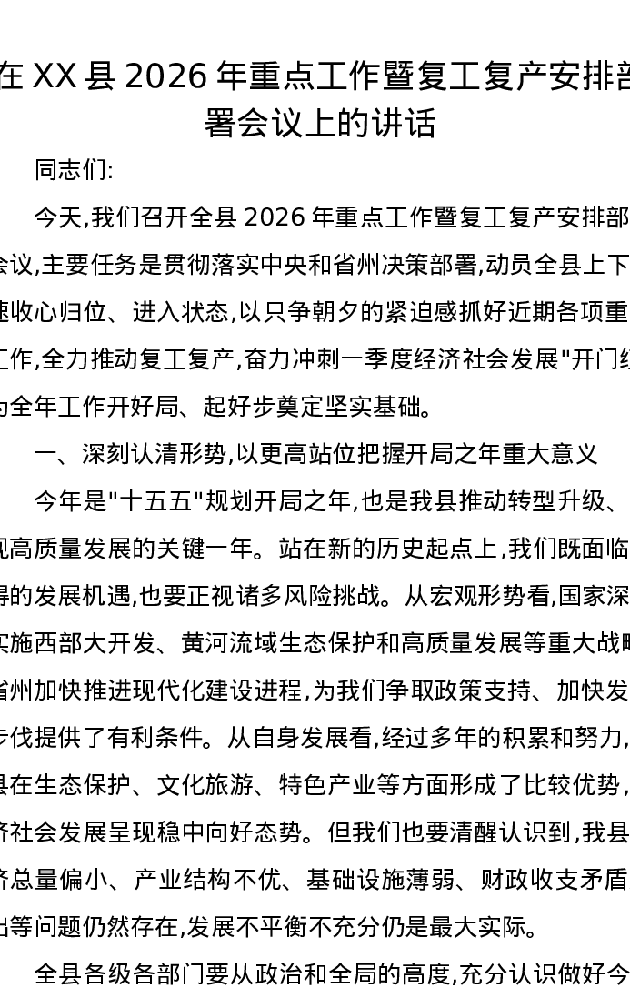 在XX县2026年重点工作暨复工复产安排部署会议上的讲话