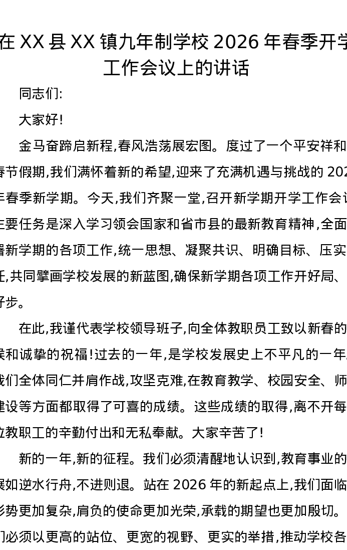 在XX县XX镇九年制学校2026年春季开学工作会议上的讲话