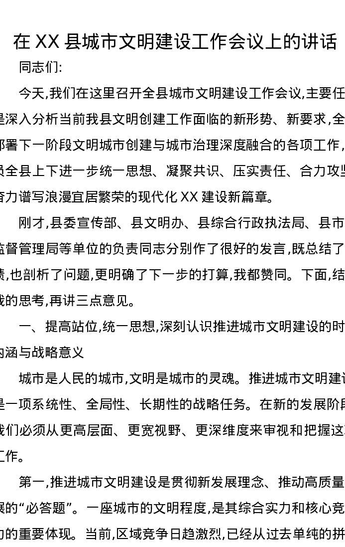 在XX县城市文明建设工作会议上的讲话