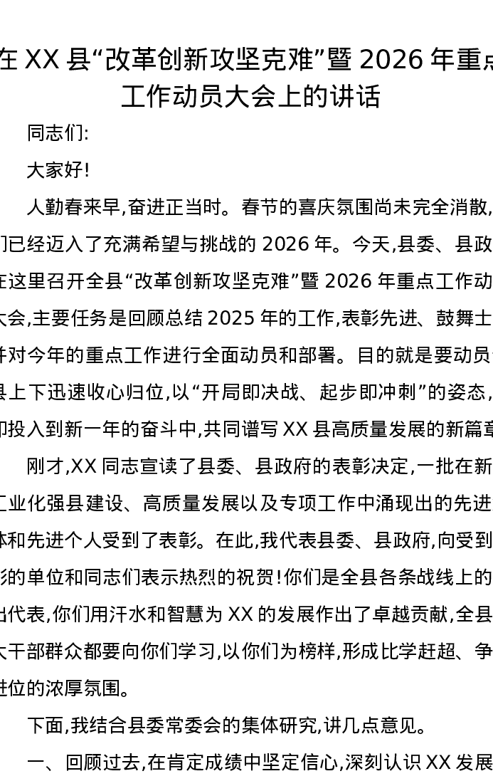 在XX县改革创新攻坚克难暨2026年重点工作动员大会上的讲话
