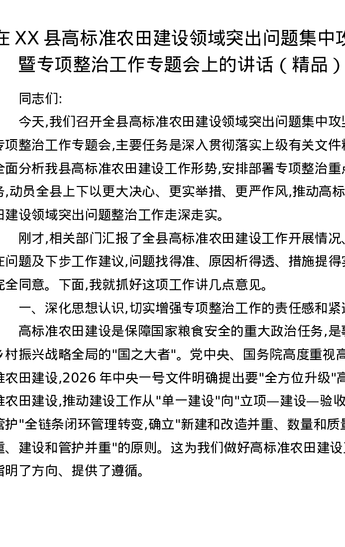 在XX县高标准农田建设领域突出问题集中攻坚暨专项整治工作专题会上的讲话
