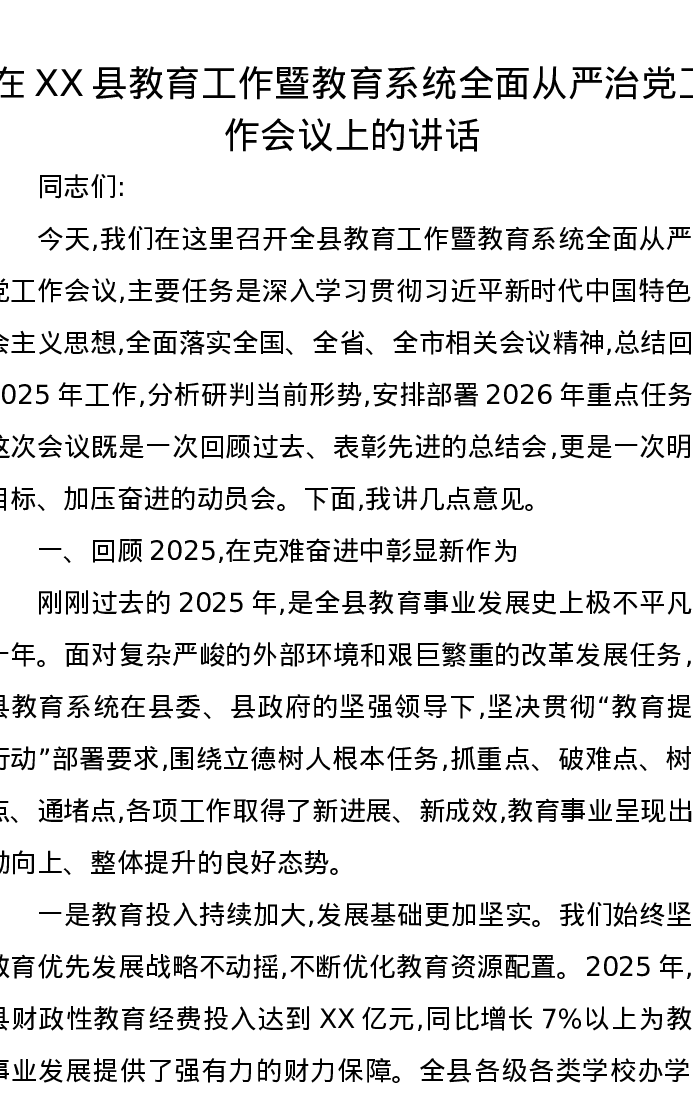 在XX县教育工作暨教育系统全面从严治党工作会议上的讲话
