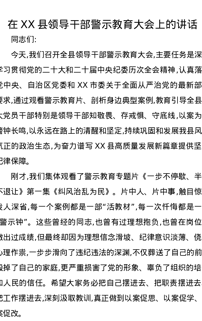 在XX县领导干部警示教育大会上的讲话