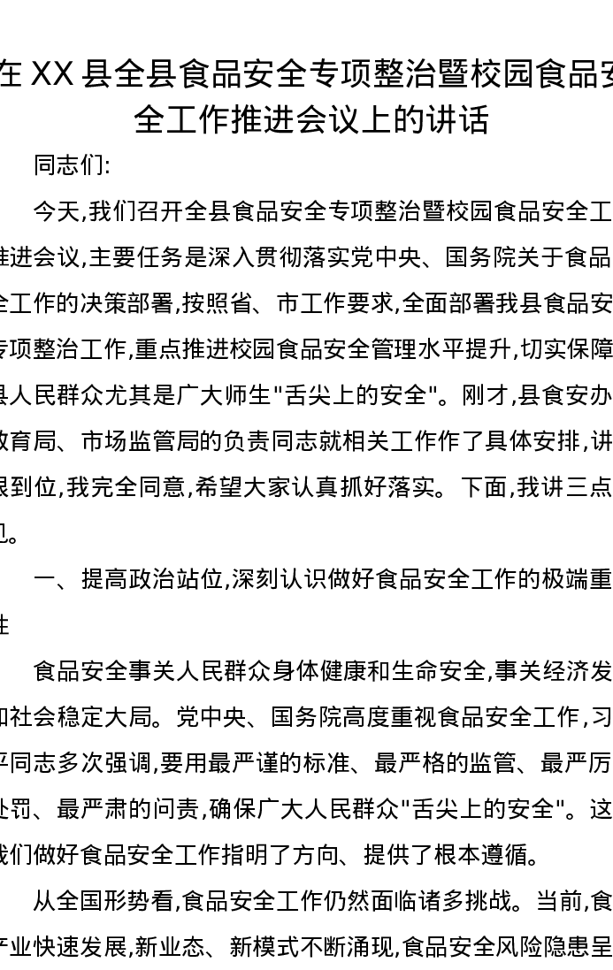 在XX县全县食品安全专项整治暨校园食品安全工作推进会议上的讲话