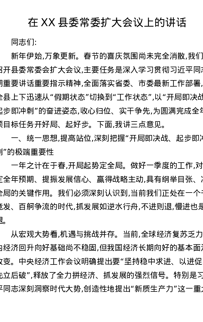 在XX县委常委扩大会议上的讲话