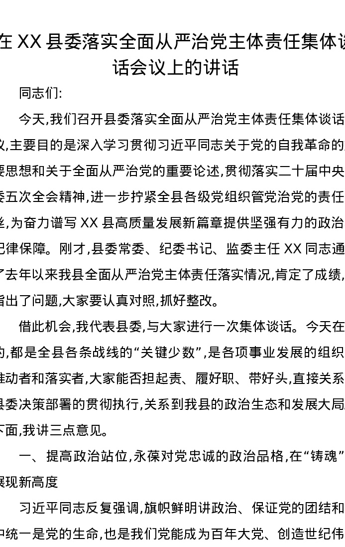 在XX县委落实全面从严治党主体责任集体谈话会议上的讲话