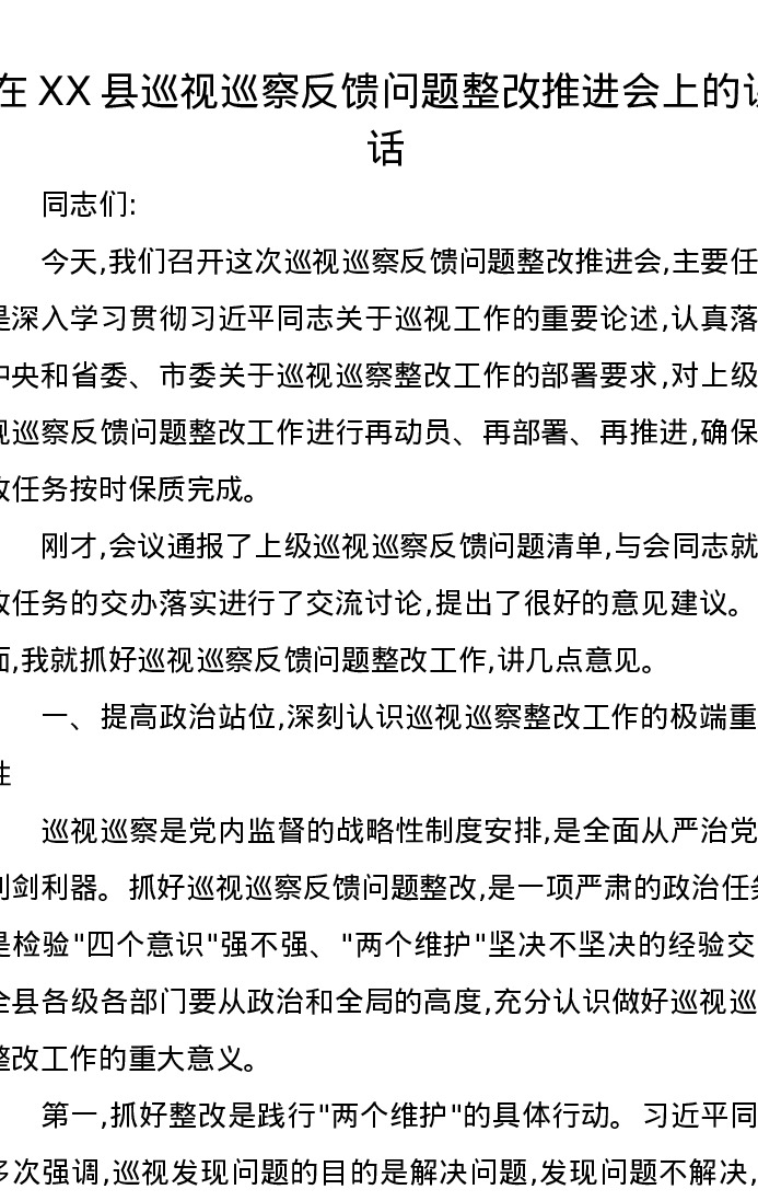 在XX县巡视巡察反馈问题整改推进会上的讲话