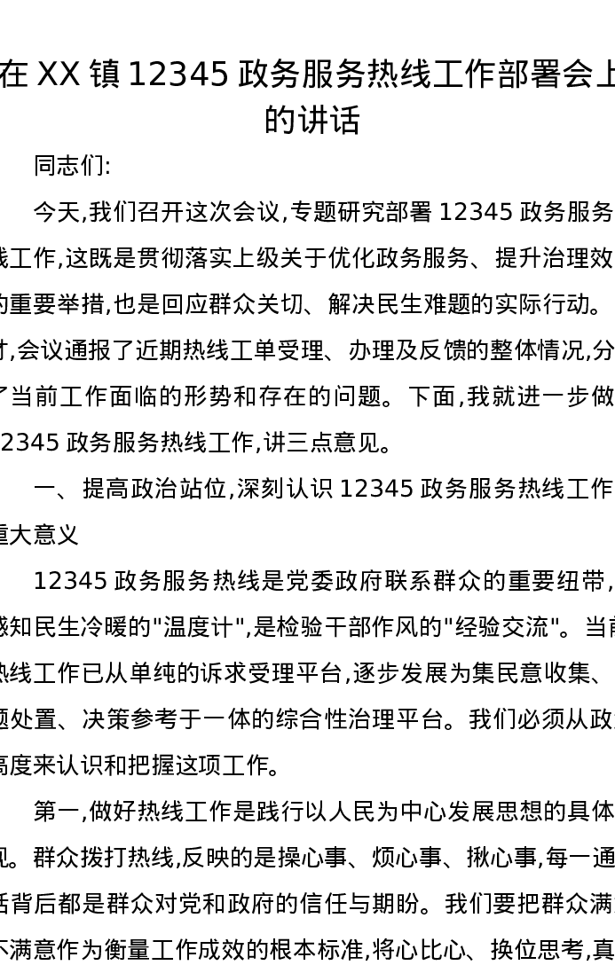 在XX镇12345政务服务热线工作部署会上的讲话