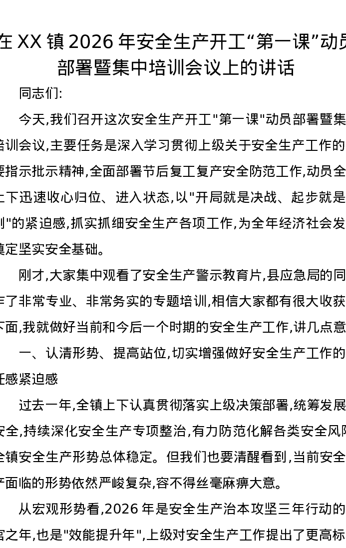 在XX镇2026年安全生产开工第一课动员部署暨集中培训会议上的讲话
