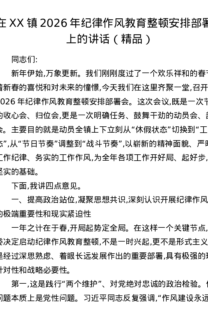 在XX镇2026年纪律作风教育整顿安排部署会上的讲话