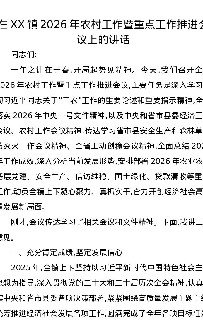 在XX镇2026年农村工作暨重点工作推进会议上的讲话