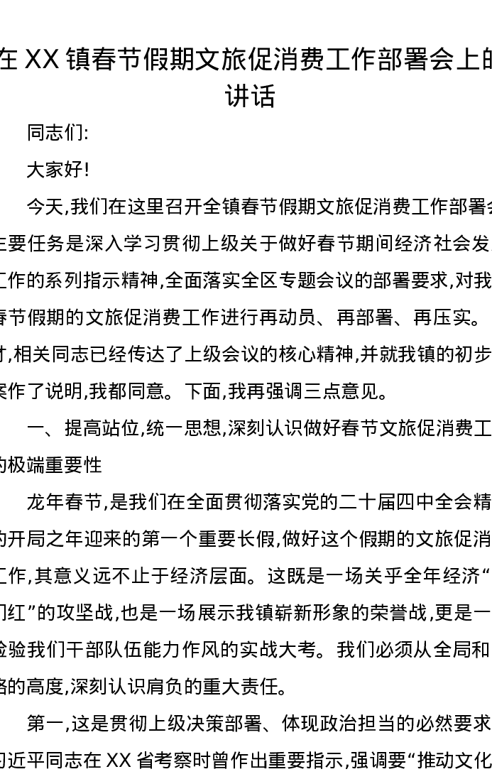 在XX镇春节假期文旅促消费工作部署会上的讲话