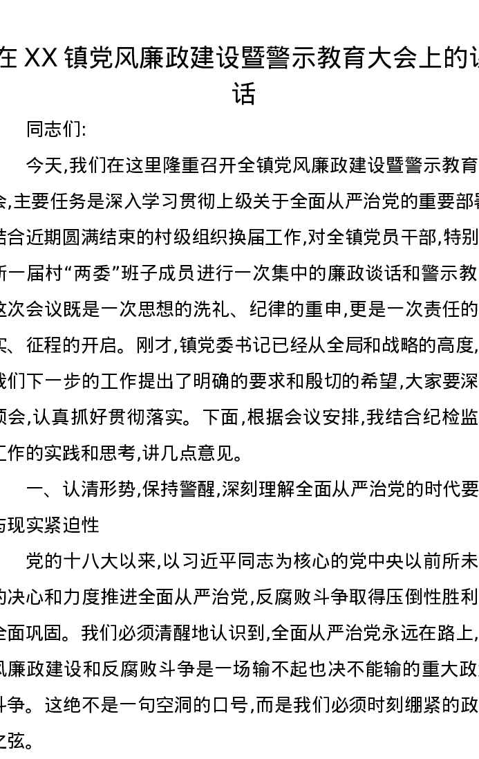 在XX镇党风廉政建设暨警示教育大会上的讲话