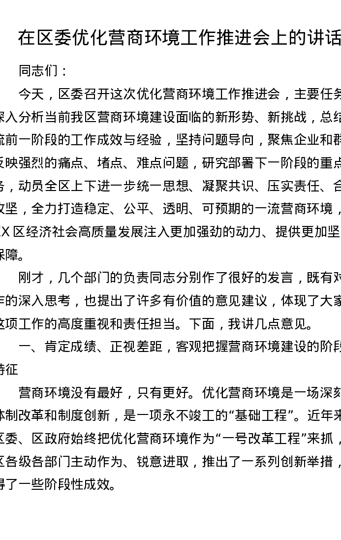 在区委优化营商环境工作推进会上的讲话