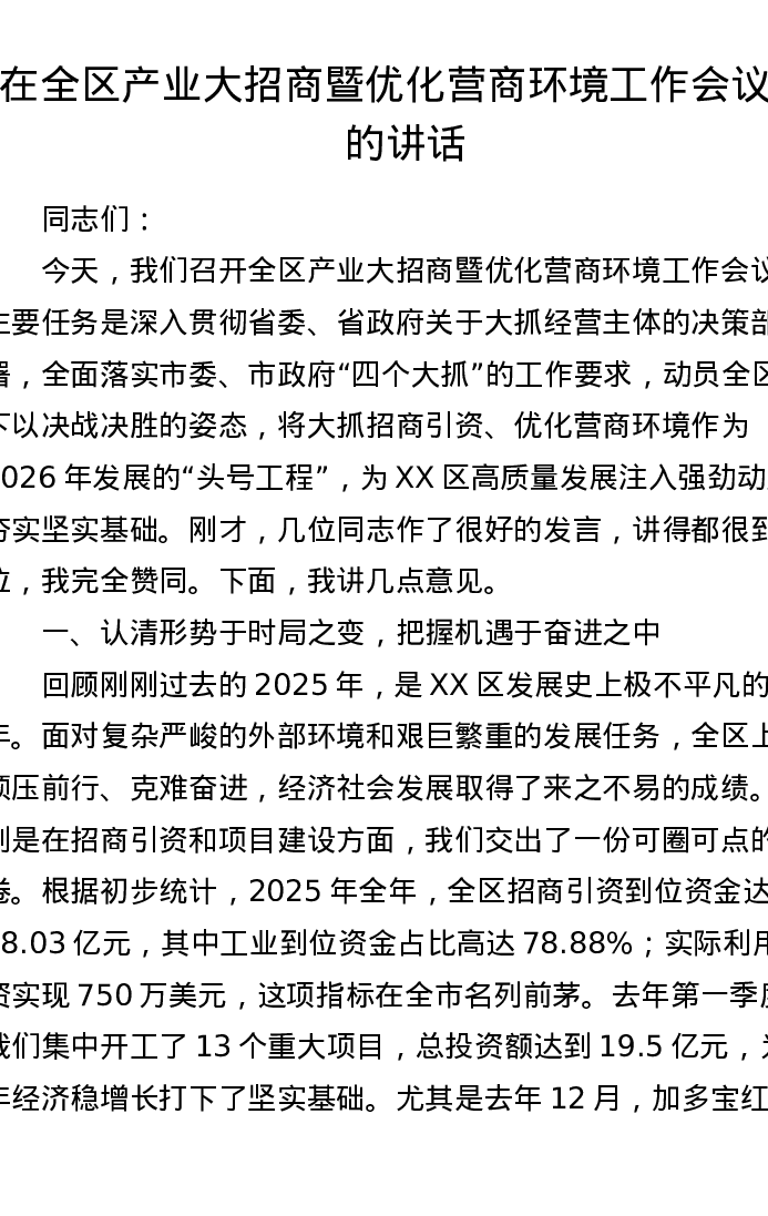 在全区产业大招商暨优化营商环境工作会议上的讲话