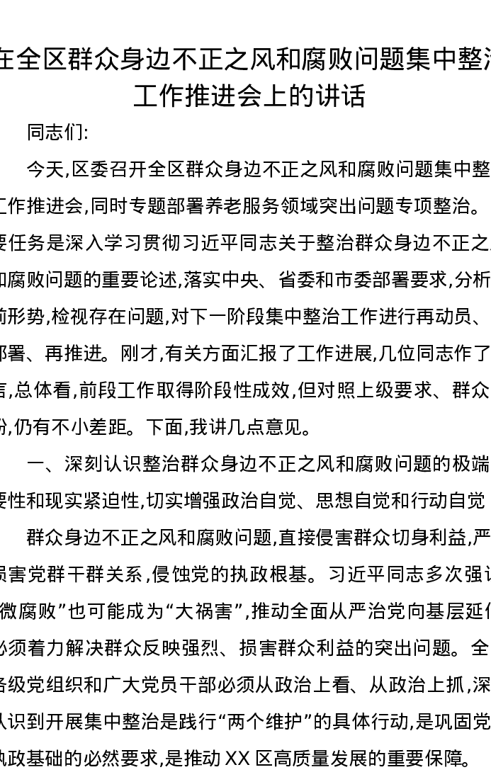 在全区群众身边不正之风和腐败问题集中整治工作推进会上的讲话