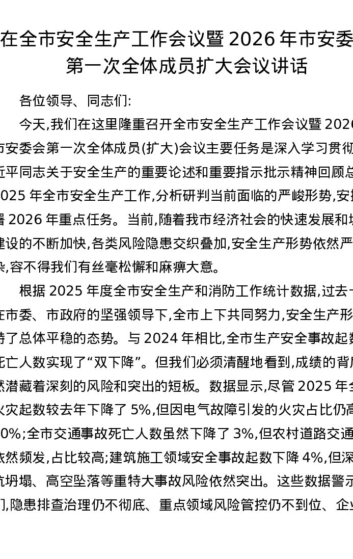 在全市安全生产工作会议暨2026年市安委会第一次全体成员扩大会议讲话