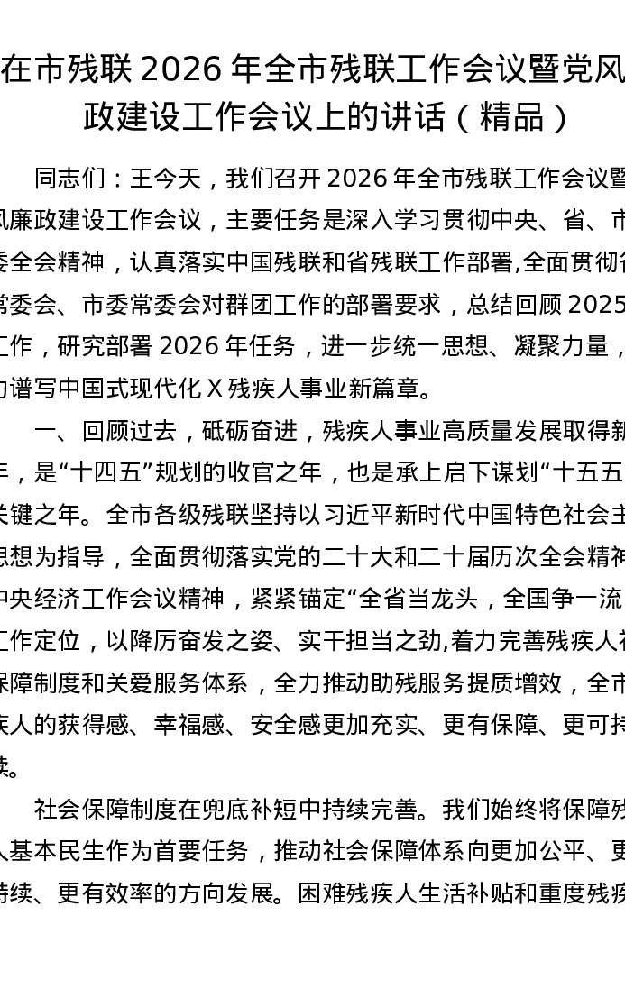 在市残联2026年全市残联工作会议暨党风廉政建设工作会议上的讲话