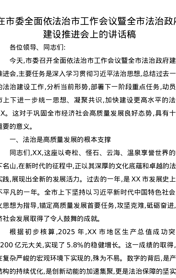 在市委全面依法治市工作会议暨全市法治政府建设推进会上的讲话稿