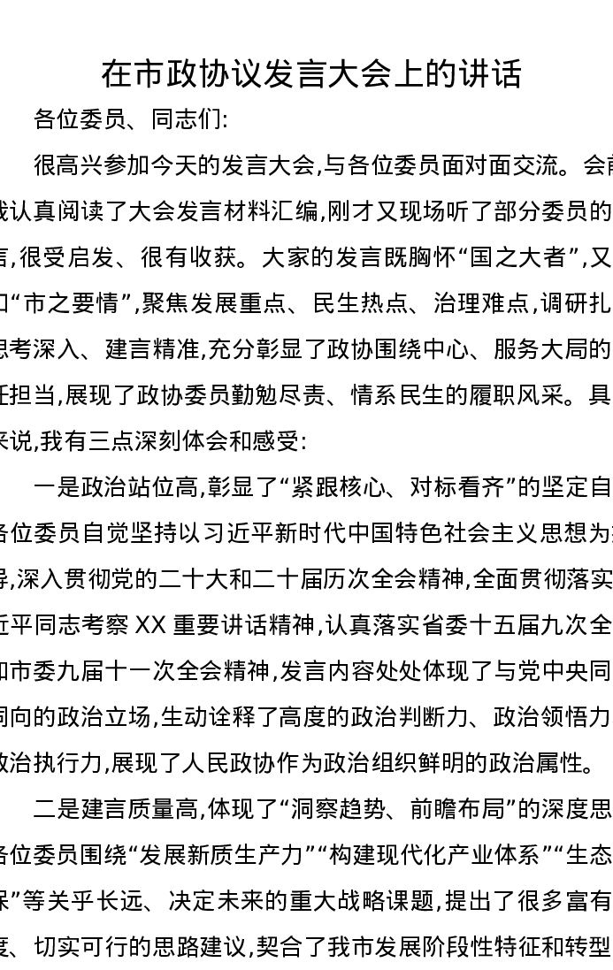 在市政协议发言大会上的讲话