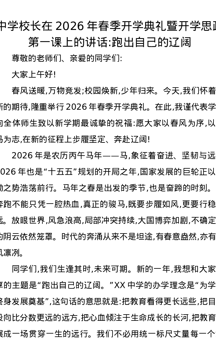 中学校长在2026年春季开学典礼暨开学思政第一课上的讲话跑出自己的辽阔