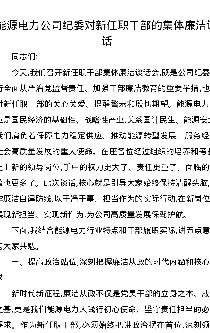 能源电力公司纪委对新任职干部的集体廉洁谈话