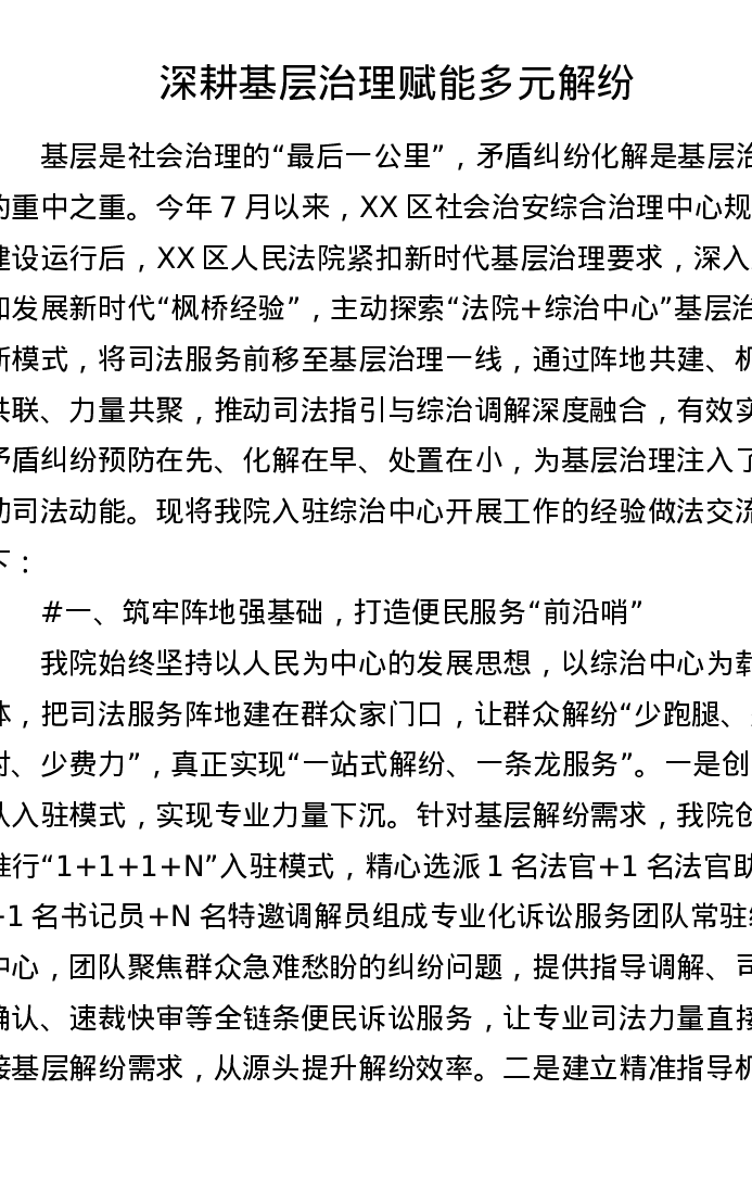 XX区法院入驻综治中心工作经验交流发言材料