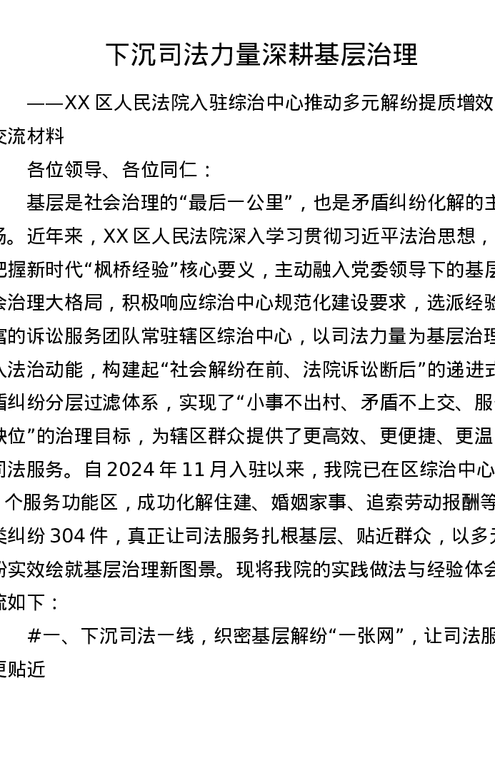 XX区人民法院入驻综治中心推动多元解纷提质增效经验交流发言材料