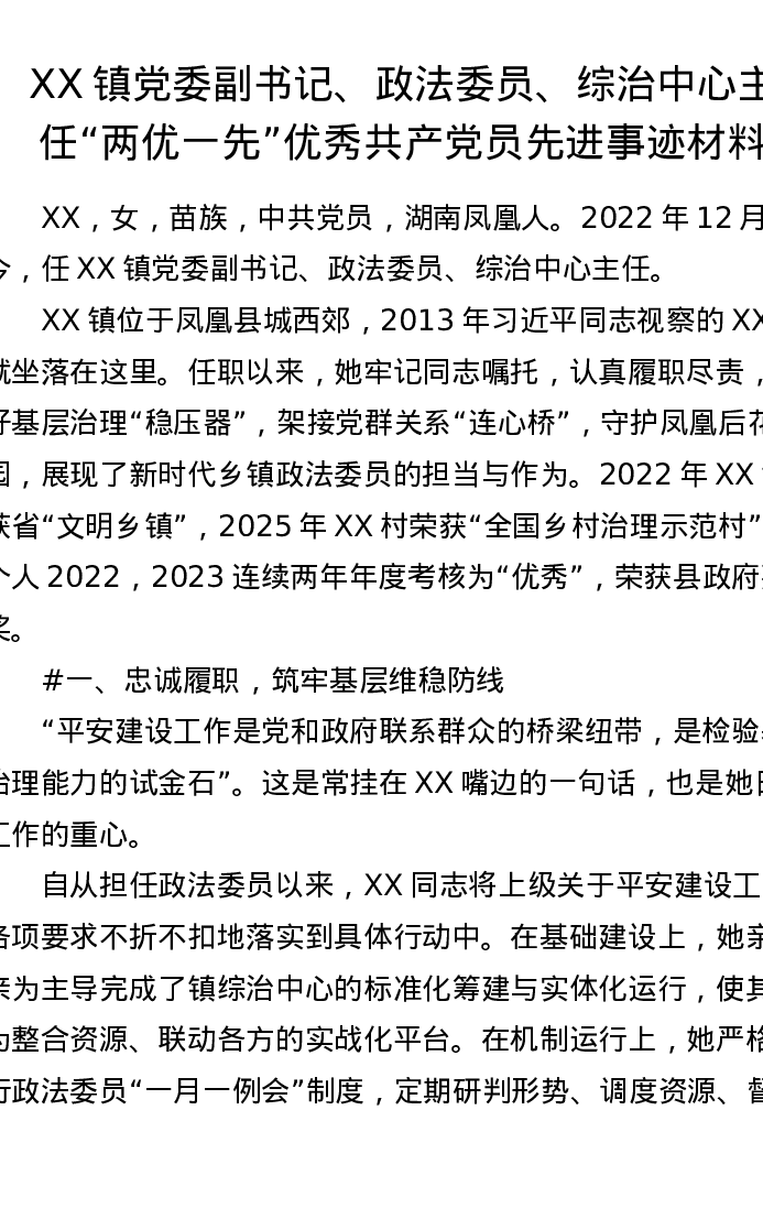 XX镇党委副书记、政法委员、综治中心主任两优一先优秀共产党员先进事迹材料