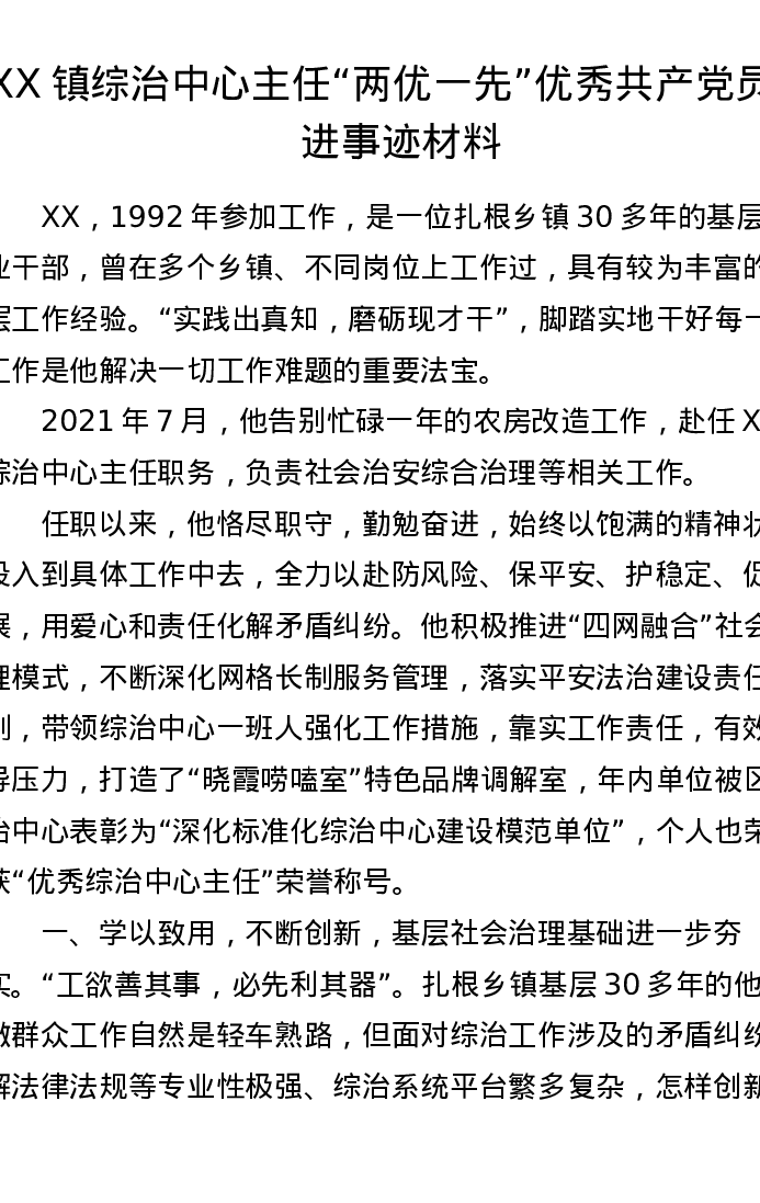 XX镇综治中心主任两优一先优秀共产党员先进事迹材料(2961字)