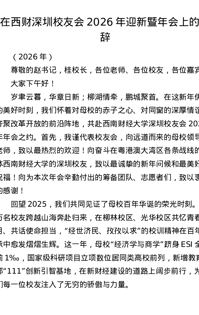 在西财深圳校友会2026年迎新暨年会上的致辞
