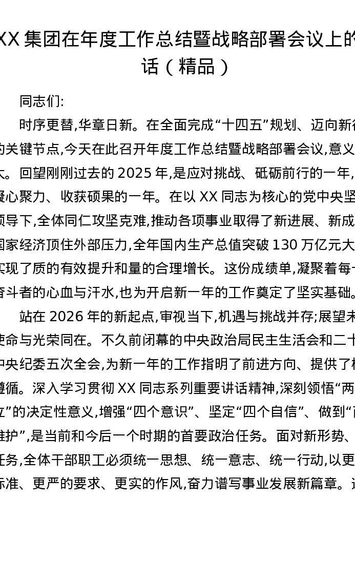 XX集团在年度工作总结暨战略部署会议上的讲话