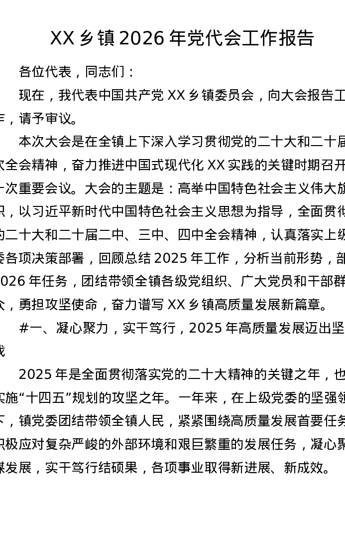 XX乡镇2026年党代会工作报告(9084字)