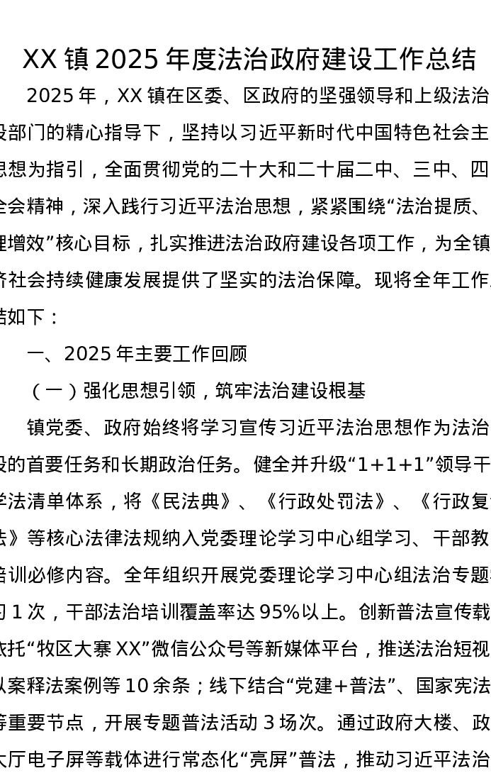 XX镇2025年度法治政府建设工作总结