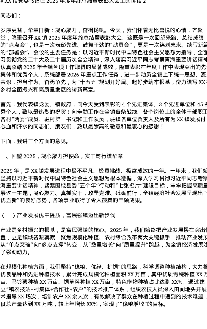 XX镇党委书记在2025年度年终总结暨表彰大会上的讲话2