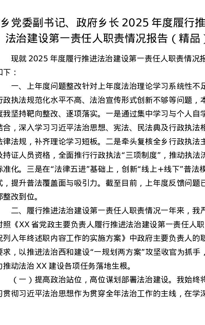 乡党委副书记、政府乡长2025年度履行推进法治建设第一责任人职责情况报告