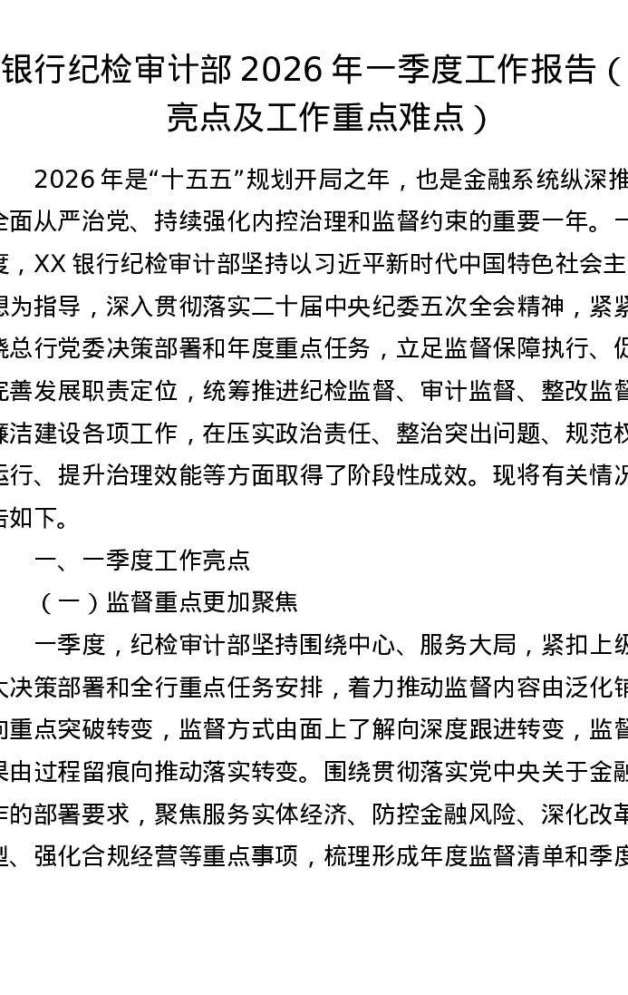 银行纪检审计部2026年一季度工作报告(含亮点及工作重点难点)