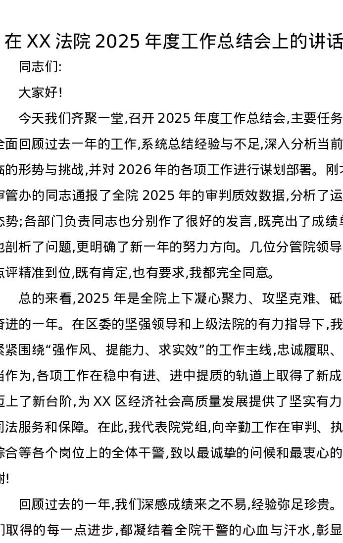 在XX法院2025年度工作总结会上的讲话