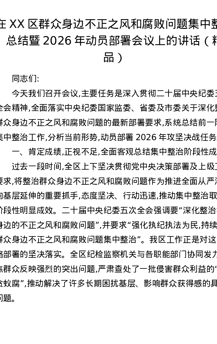 在XX区群众身边不正之风和腐败问题集中整治总结暨2026年动员部署会议上的讲话